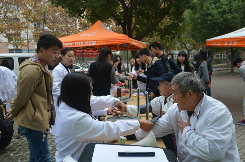 上午九点大家正式在东苑食堂路开始了义诊活动。首先先将温暖传递给了食堂周围的阿姨大叔们;我们送药茶,为他们量血压。活动现场人头攒动,活动现场项目有量血压,猜药名得香囊,品药茶,耳穴埋籽,推拿按摩等,活动现场大家积极参与,热情高涨,气氛融洽。其中最受欢迎的是猜中药迷赢香囊,心灵手巧的南中医姑娘们自制的香囊分为安眠定神和预防感冒两种,但不论是哪一种,都很受大家喜爱,短短两个小时之内一百多个香囊早早就被领完,大家忙得不亦乐乎。