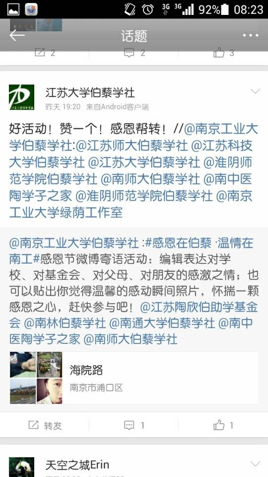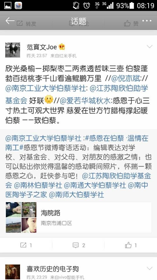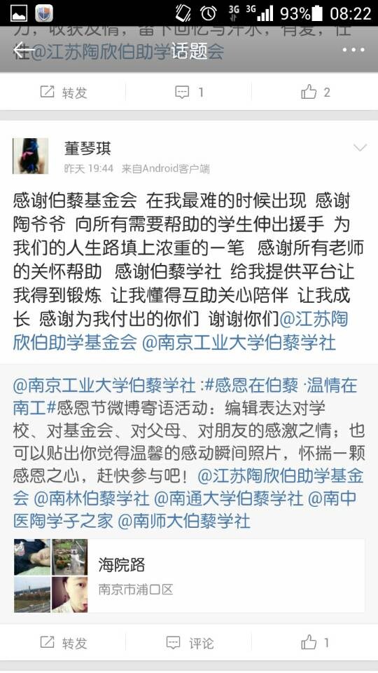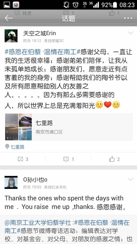 感恩的心,感谢有你。从活动发起引起巨大反响,到大家热情洋溢积极参与,截至28日凌晨,短短六个小时在新浪微博发布转发感恩节寄语四十余条,相关寄语点赞超过百余次,“感恩在伯藜·温情在南工”话题阅读数超过9700次。此次活动还受到了基金会的支持和《陶欣伯人生小故事》作者倪亦斌倪老师的转发,还有兄弟伯藜学社的点赞和支持。