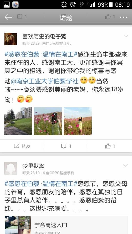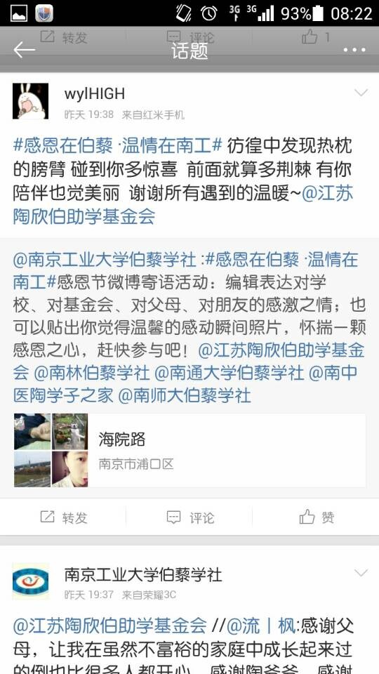 2014年11月27日,又是一年的“感恩节”,为感恩蓄力,为慈善助力,为表达南工陶学子们心中的感恩之情,南京工业大学伯藜学社通过新浪微博平台发起“感恩在伯藜·温情在南工”感恩节寄语活动。