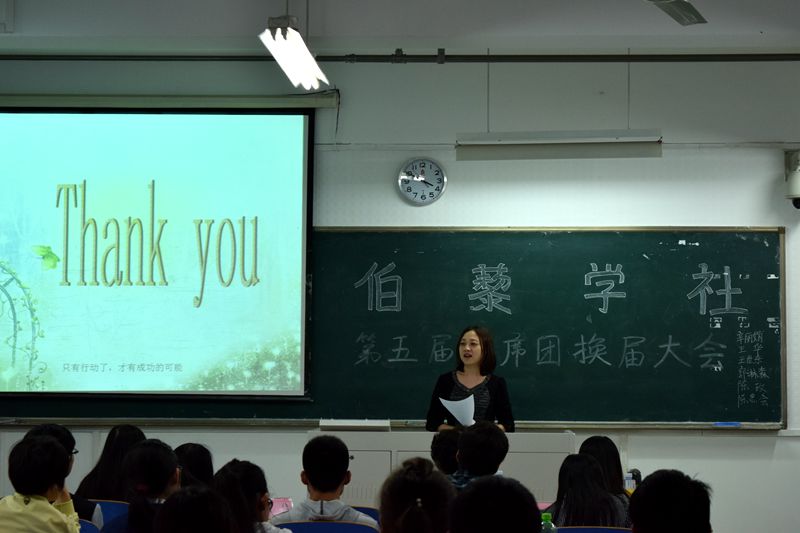 竞选演讲环节结束后,宫佳老师就本次换届选举致总结辞。宫佳老师肯定了包括社长骆美红在内的伯藜学社主要负责人对伯藜学社的服务与工作热情,也肯定了6位候选人上台竞选的勇气,并且对基金会老师的到场表达了真挚的感谢。她强调了一个“学”字,鼓励我们多多学习其他高校伯藜学社的优质活动。此外,宫佳老师希望陶学子们常怀感恩之心,把伯藜学社当成一个家,用心参与社团活动。对于新主席团,她提出以下要求:其一,实在做事,踏实交流。利用好基金会平台,与张颖老师经常交流,每学期立足做好十件事;其二,更好地完善规章制度;其三,大力推广项目立项,提高陶学子的参与度。对于陶学子们,她希望我们明确心中之“志”,努力上进。